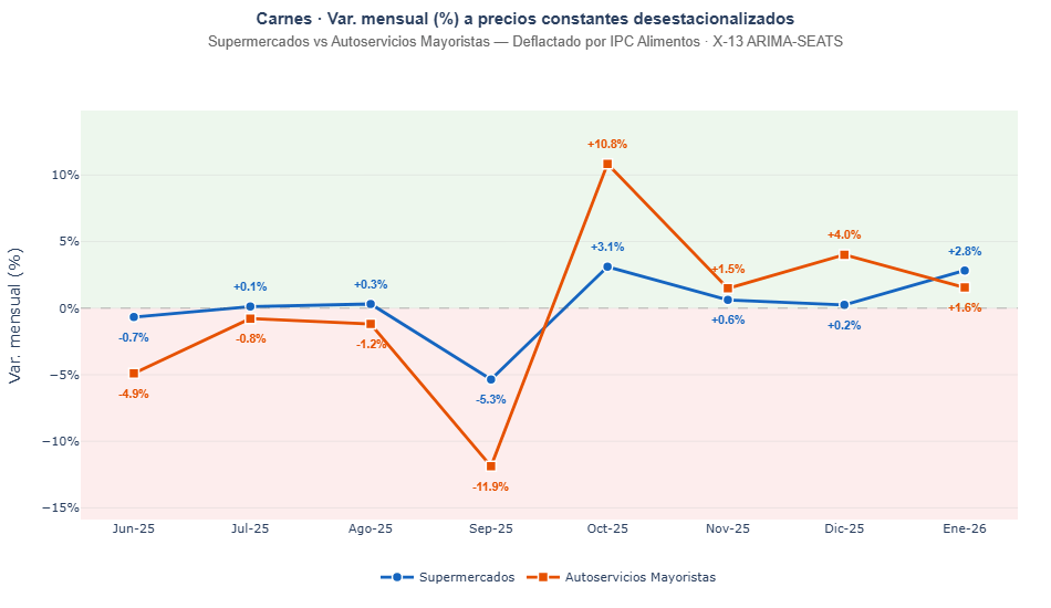 El PIB en el IV-25 creció en su serie desestacionalizada un +0,6%. Desde data y acción pronosticamos un +0,9%. A su vez, hemos descargado la serie del INDEC relativa a la encuenta supermercados y autoservicios mayoristas para analizar la serie de ventas de Carnes.