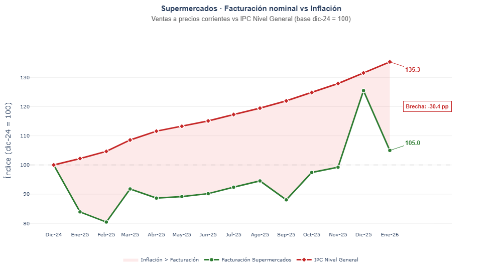 La línea roja es la evolución de la inflación mes a mes tomando como año base diciembre 2024. La linea verde, por su parte, el nivel de facturación nominal (a precios corrientes) de los supermercados. Vean que ésta último siempre se encontró por debajo en su velocidad de aumento que de aquella velocidad a la cual ascendió el nivel general de precios.